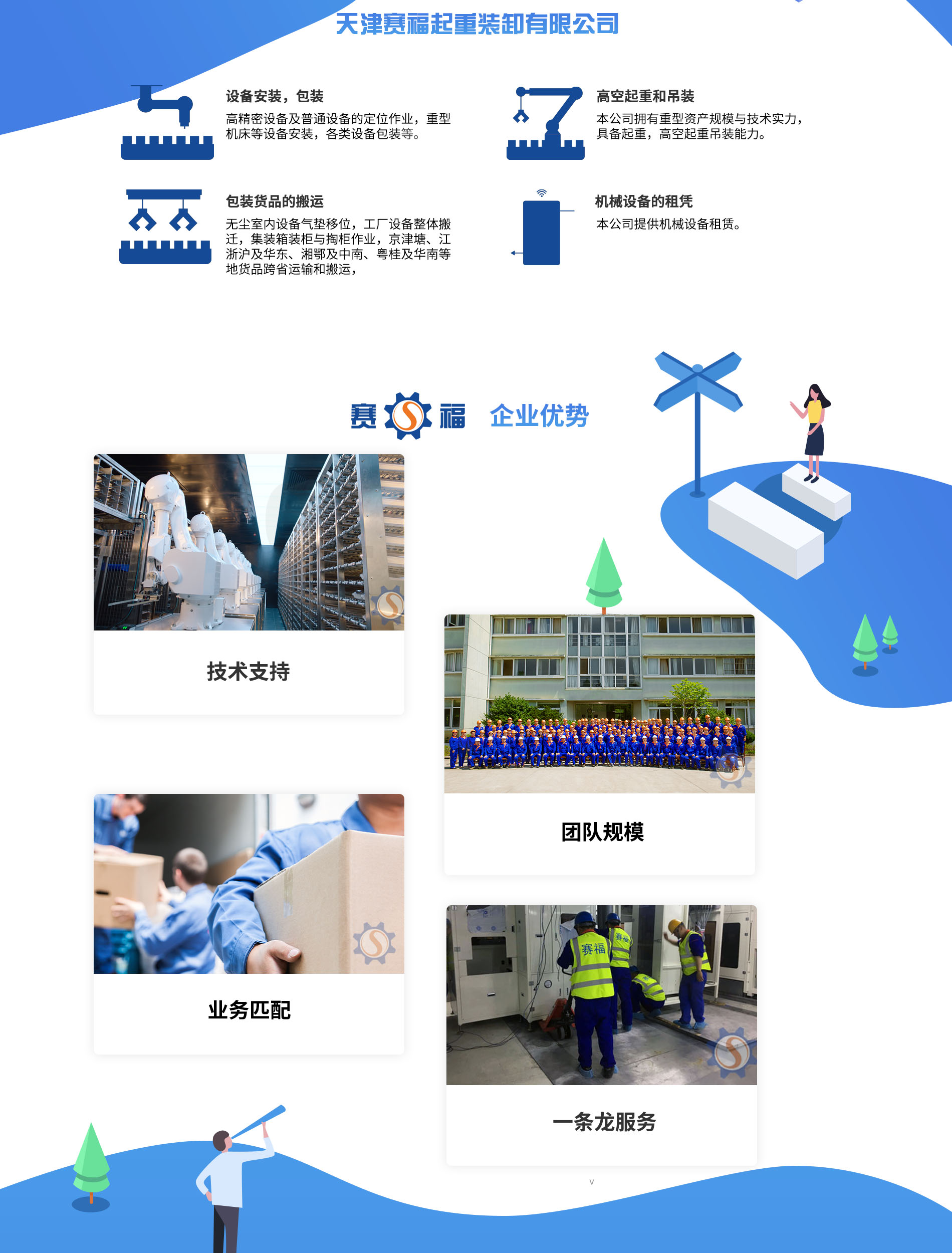 天津賽福起重裝卸有限公司成立于2010年,前身為天津明通達運輸有限公司。本公司擁有重型資產規模與技術實力,具備起重、裝卸、運輸、精密設備安裝、精密設備包裝、無塵室內移位等領域的綜合解決能力和操作能力,公司為國內外客戶提供作業服務的硬件和軟件水平,均得到當地及周邊地區各界的高度認同。合作企業單位:電子行業(三星電子等)、汽車生產行業(豐田、寶馬等)以及各大設備生產企業等,客戶領域涵蓋世界500強企業、外資企業(日資、德資、美資等)、中外合資企業、各大中小企業以及事業單位等等。我公司業務范圍:各類大件運輸、高空起重吊裝,高精密設備及普通設備(SMT、CNC、注塑機、高速沖床、放電機、壓鑄機、線切割、鐳射加工機等)裝卸、搬運、定位作業,重型機床等設備安裝,各類設備包裝,無塵室內設備氣墊移位,工廠設備整體搬遷工程與搬遷方案設計,集裝箱裝柜與掏柜作業,京津塘、江浙滬及華東、湘鄂及中南、粵桂及華南等地貨品跨省...